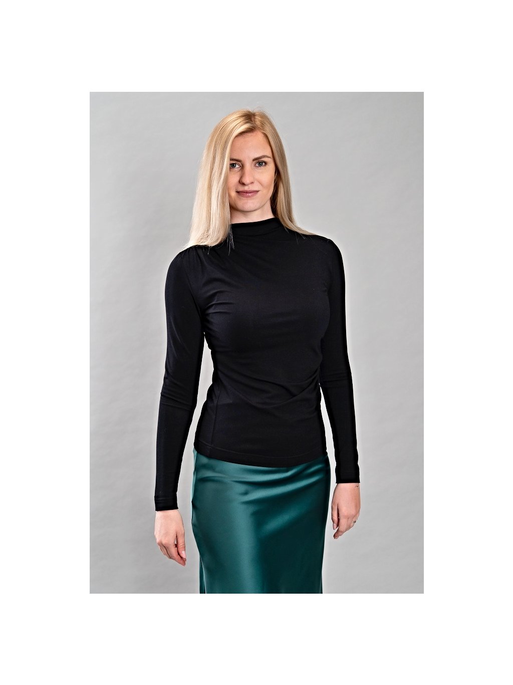 Tato asymetrická dámská halenka s dlouhým rukávem zaujme svým elegantním stojáčkem a řasením u výstřihu i v boku,