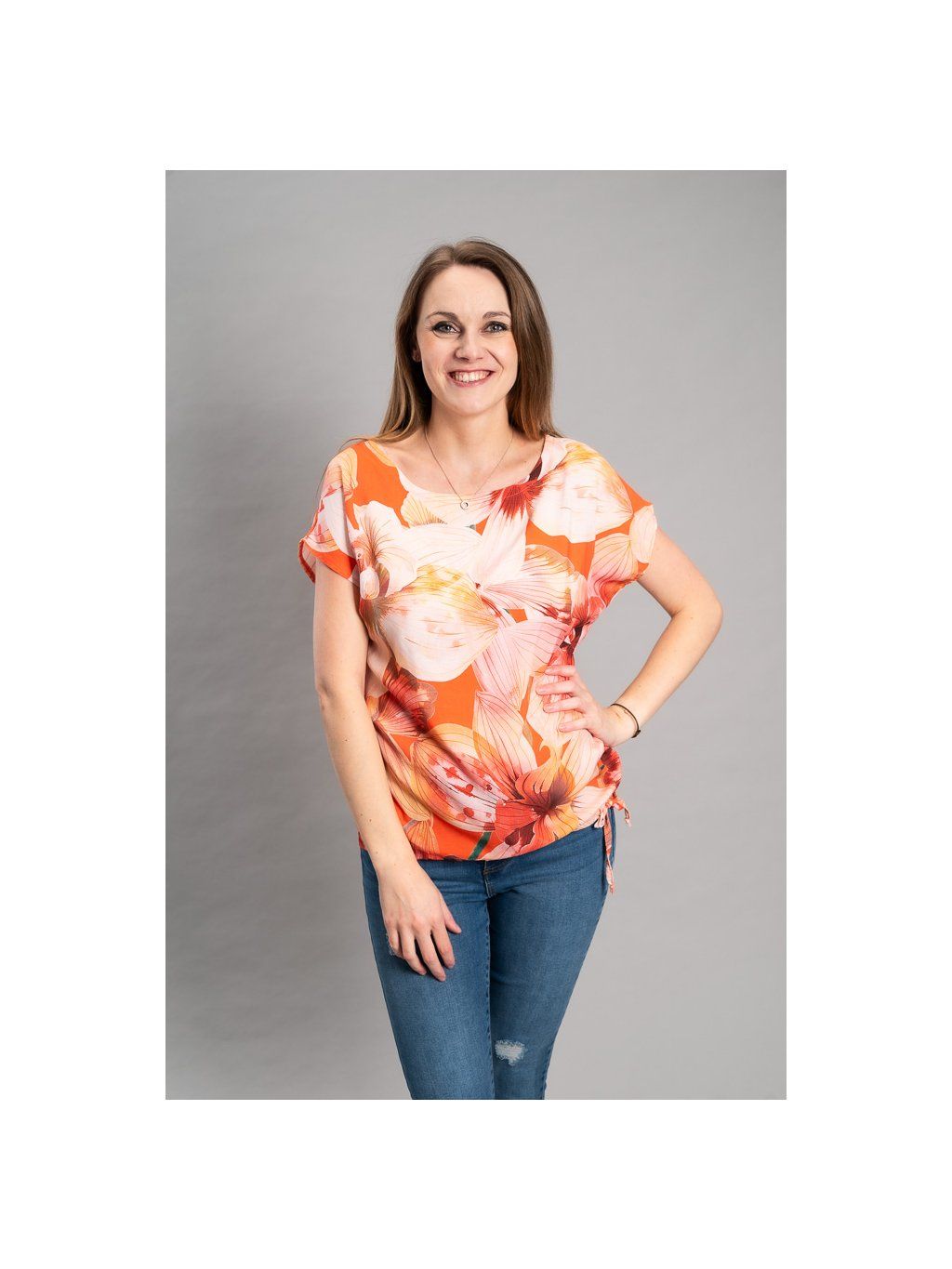 Halenka má kulatý výstřih a spadené rukávy, které dodávají modelu uvolněný, moderní vzhled. Díky volnějšímu střihu poskytuje dostatek komfortu a sluší různým typům postav. V dolní části je doplněna o možnost stažení, díky které si můžete upravit délku.