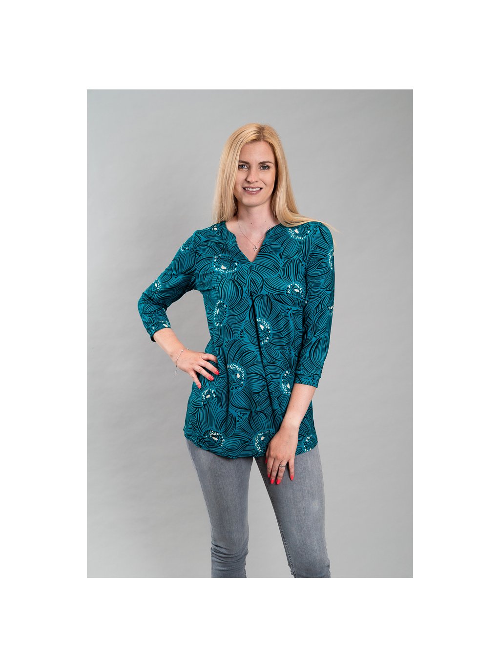 Kulatý výstřih s prostřižením do V dodává modelu ženský a moderní vzhled. 3/4 rukáv je univerzální pro celoroční využití.