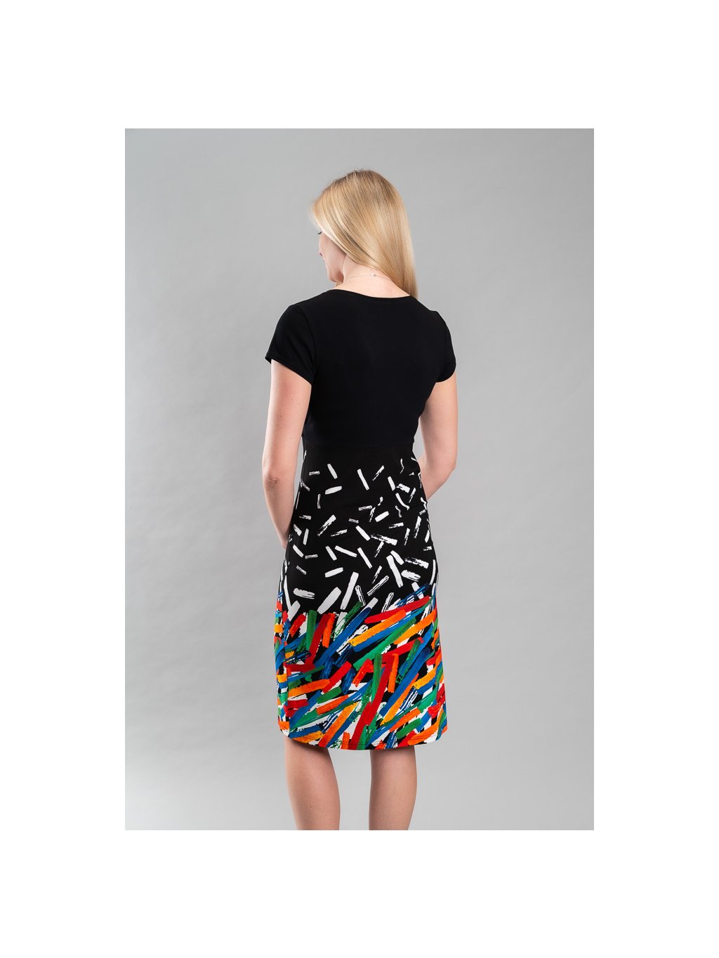 Jednobarevný přeložený vrchní díl působí elegantně a lichotí dekoltu, zatímco krátké rukávy dodávají šatům vzdušnost a letní charakter.