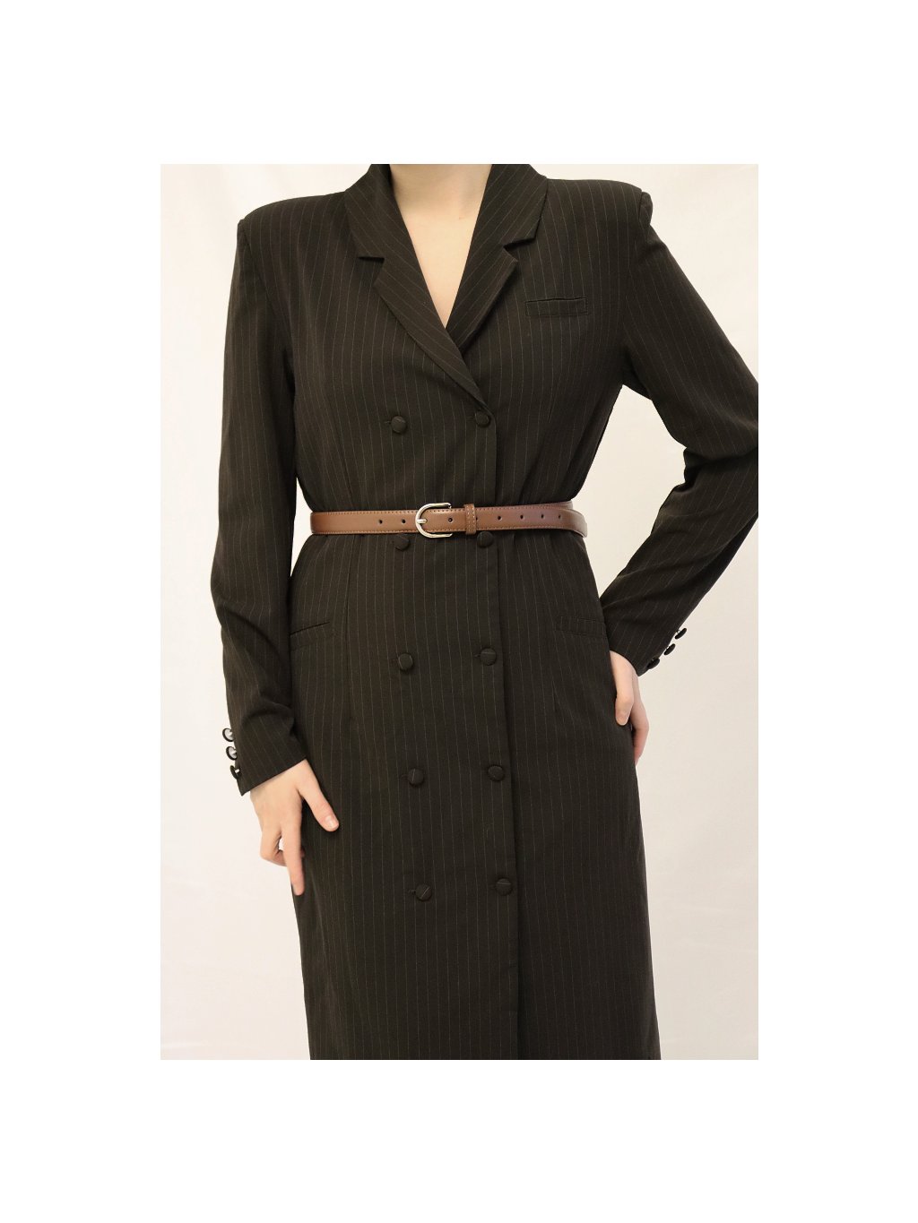 Dámské propínací šaty s klopami, jemný proužek hnědá