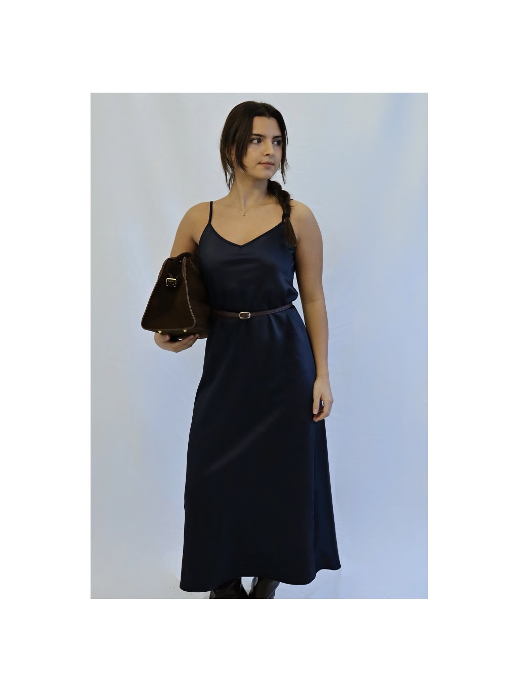 Tyto saténové šaty s úzkými posuvnými ramínky působí jemně, žensky a luxusně zároveň.