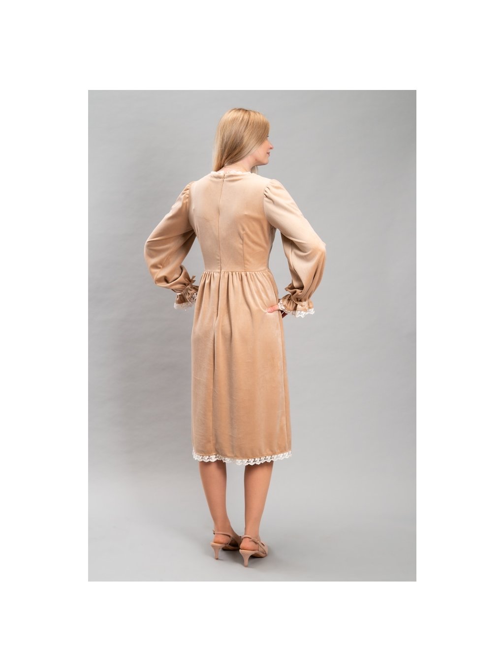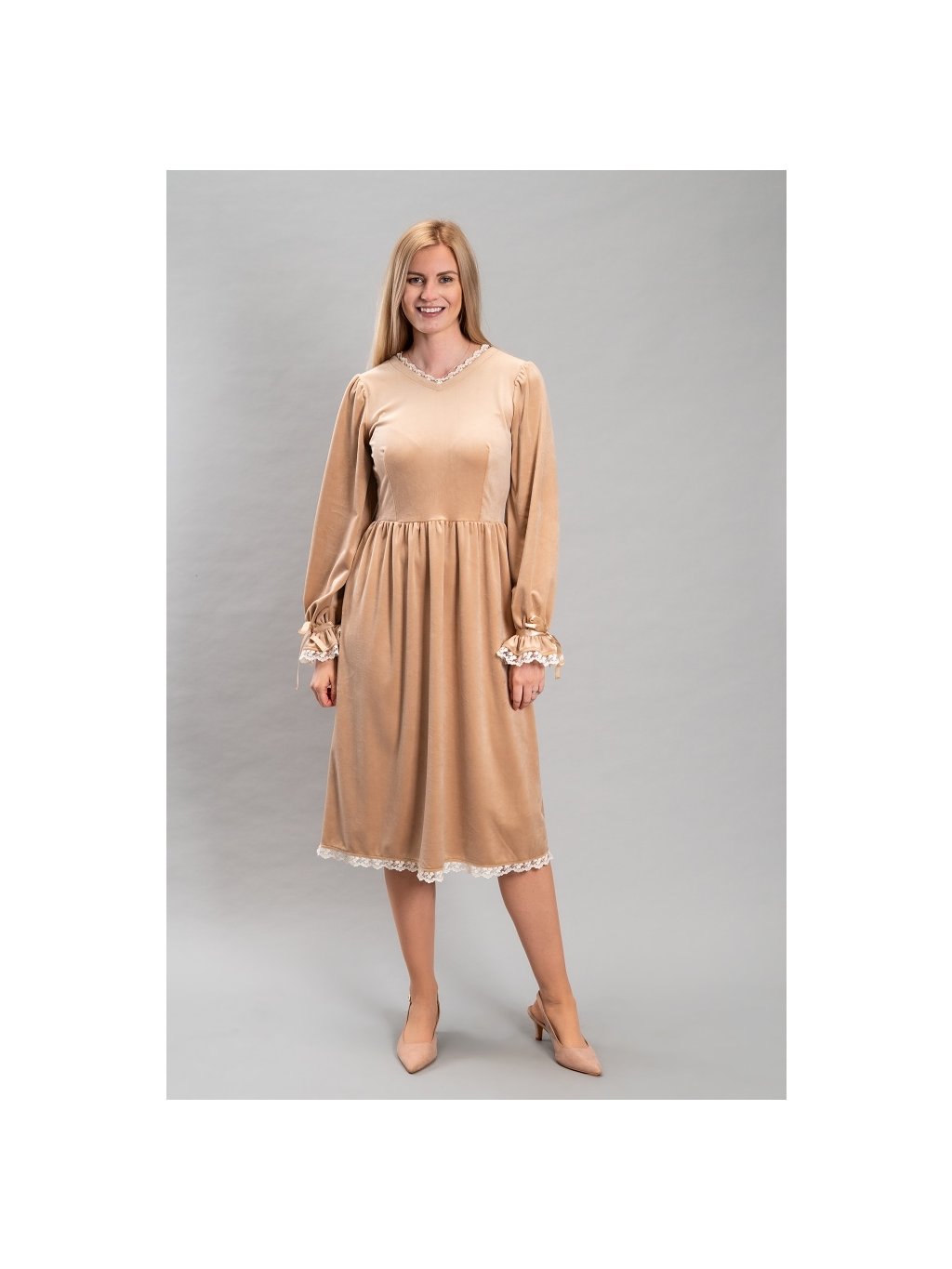 Díky řasení, krajkovým detailům a nabíraným rukávům působí šaty žensky a originálně.