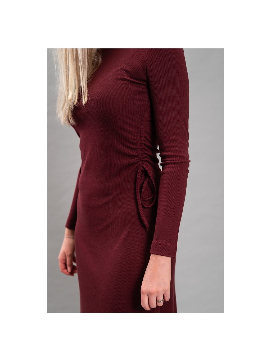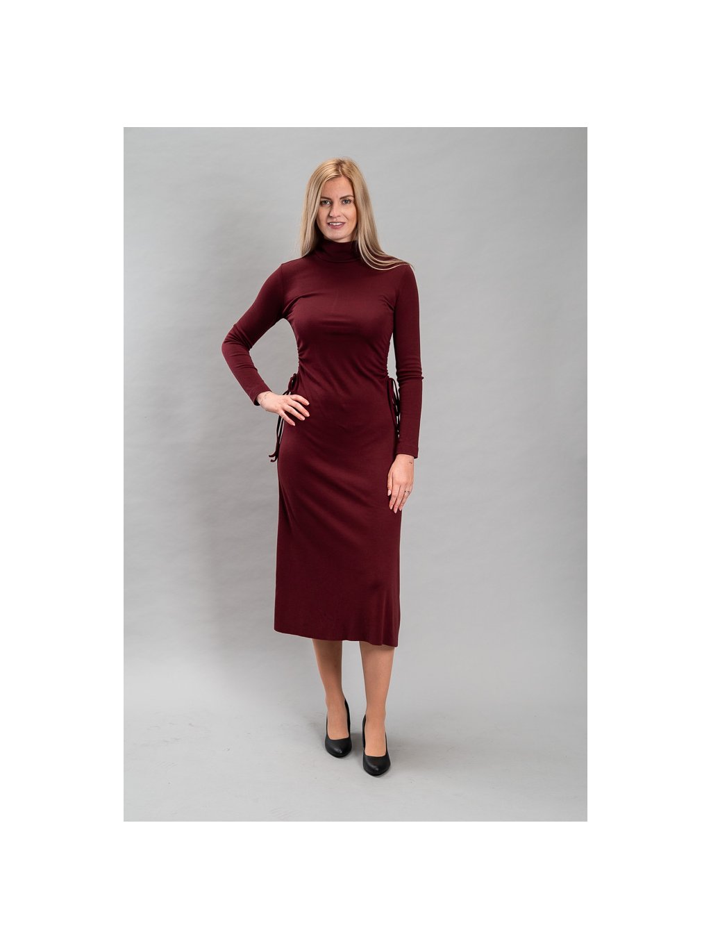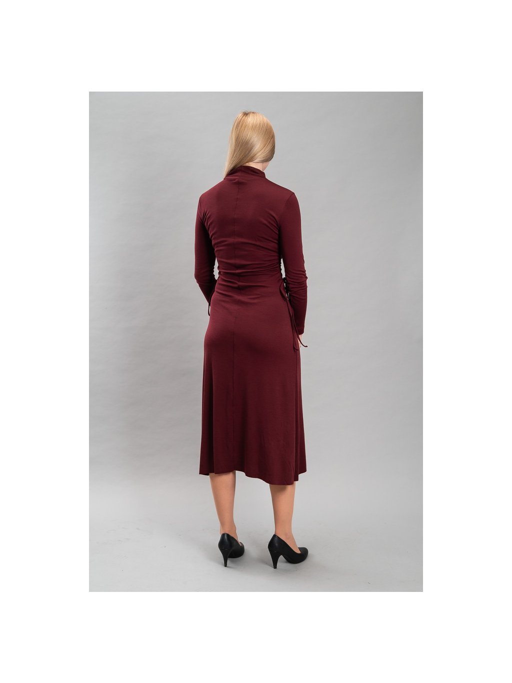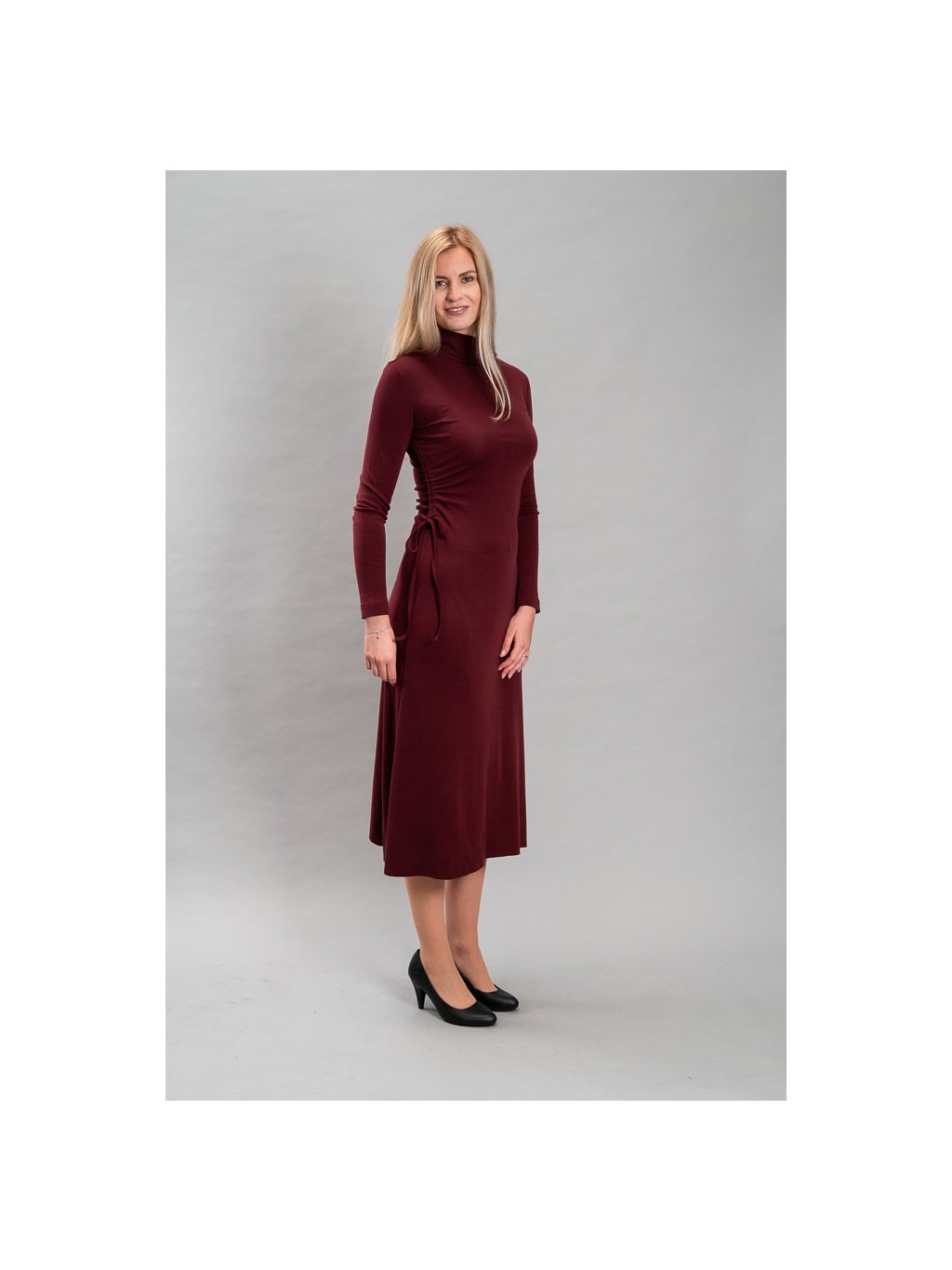 Model má dlouhý rukáv a jemný stojáček, který dodává šatům čistý a sofistikovaný vzhled.