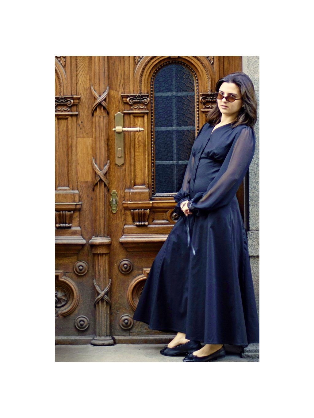 Šaty jsou propínací po celé délce, což umožňuje variabilní nošení a dodává modelu moderní charakter. Výrazným prvkem jsou lehké šifonové rukávy, které působí vzdušně a dodávají šatům romantický a ženský nádech.