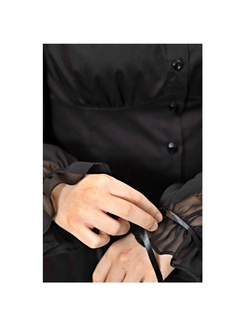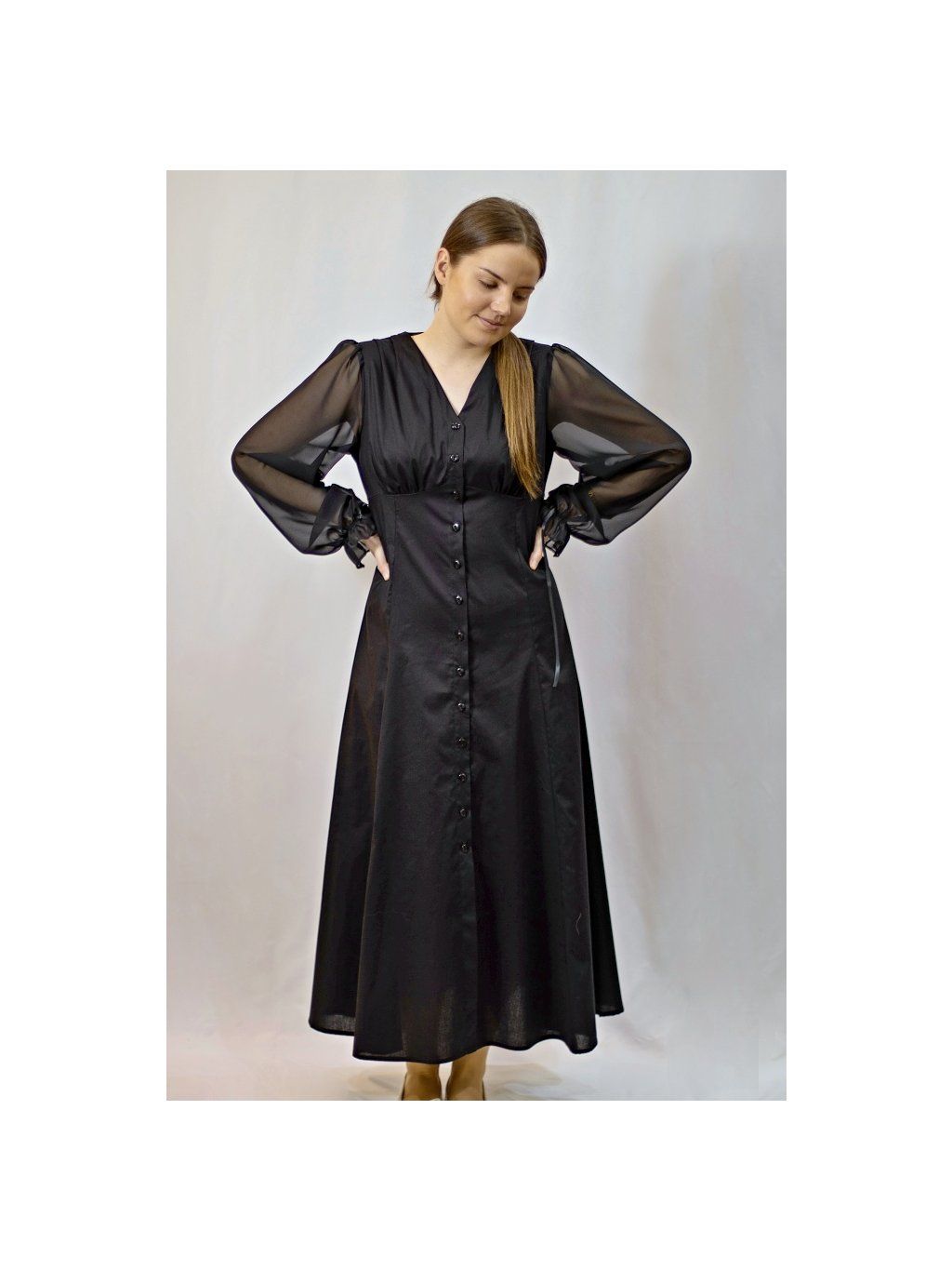 Šaty jsou propínací po celé délce, což umožňuje variabilní nošení a dodává modelu moderní charakter. Výrazným prvkem jsou lehké šifonové rukávy, které působí vzdušně a dodávají šatům romantický a ženský nádech.