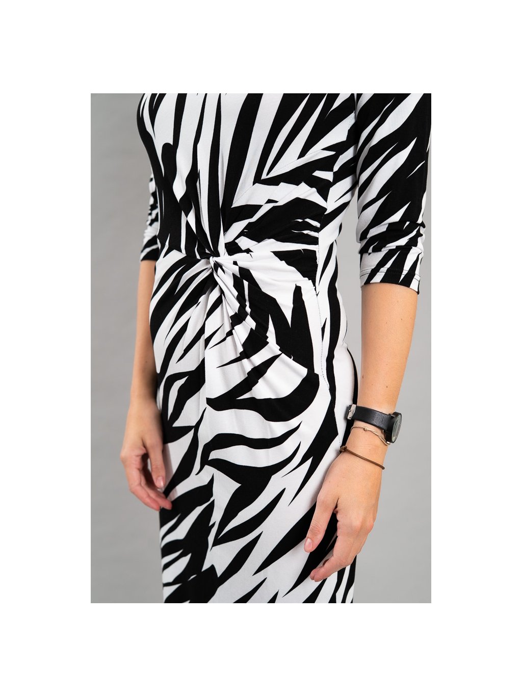 V pase je ozdobný uzel, který opticky zvýrazní siluetu a dodá šatům originální vzhled.