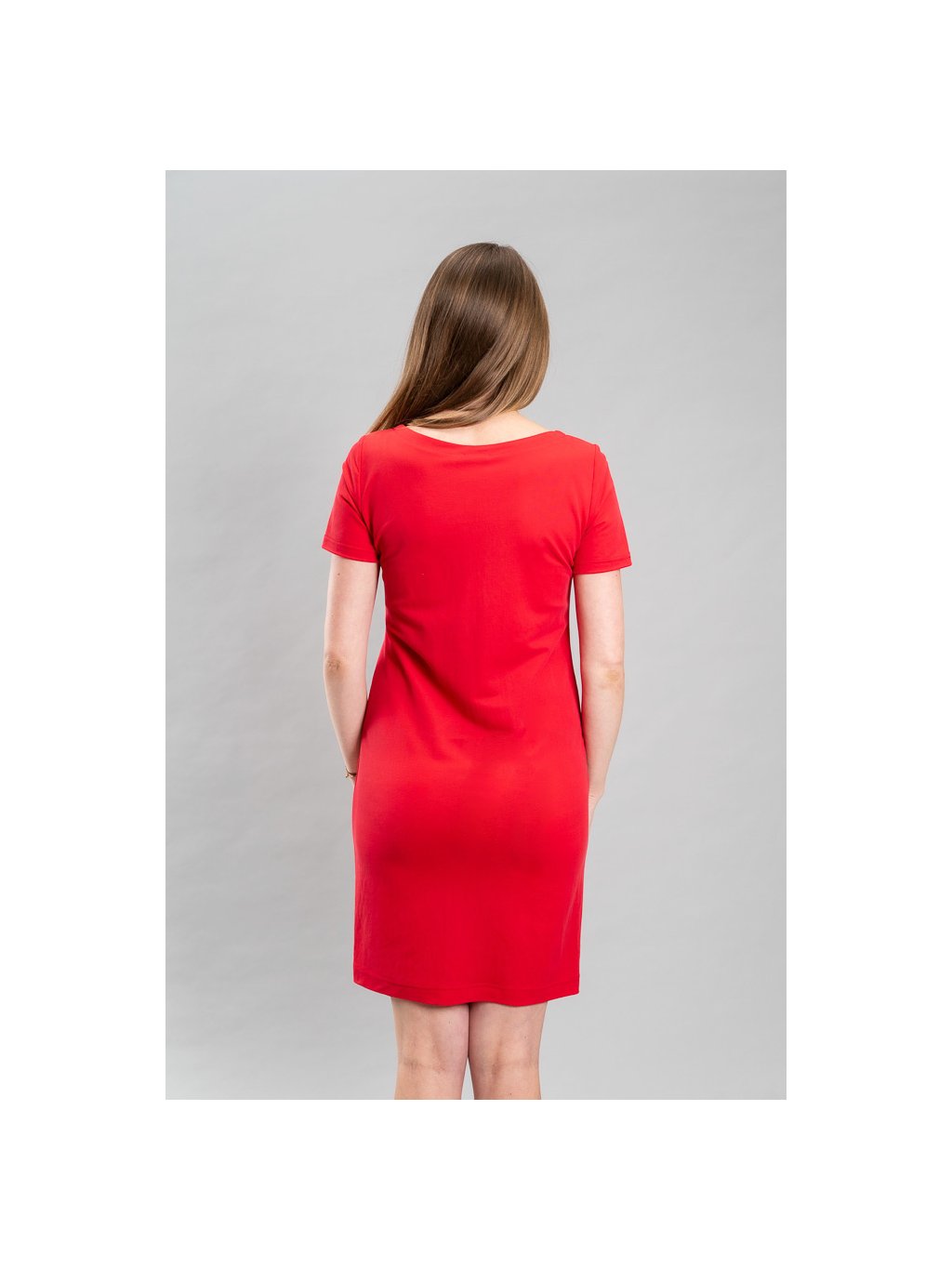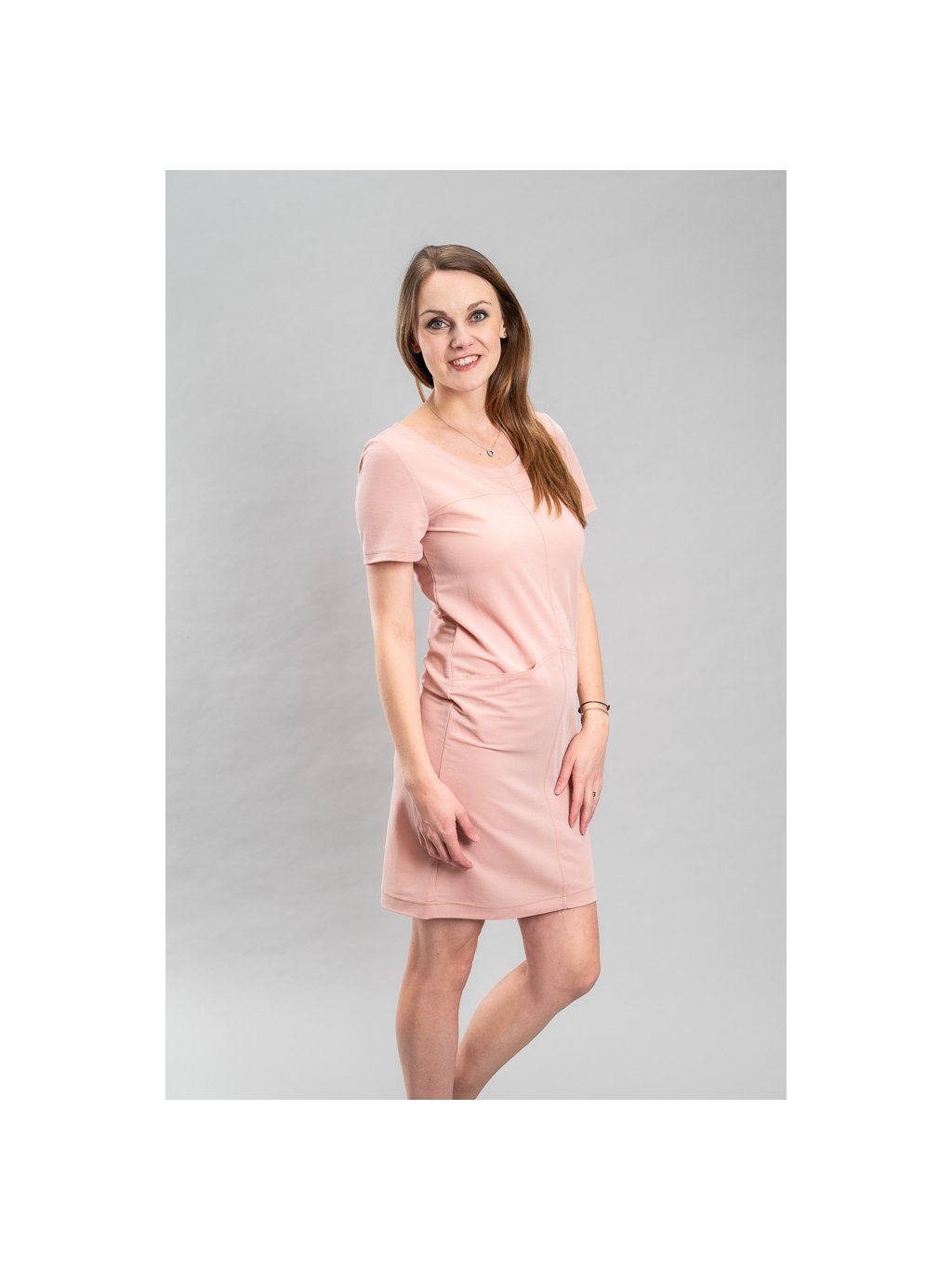 Šaty mají kulatý výstřih, krátký rukáv a jsou členěné, což vytváří zajímavou siluetu a přidává modelu dynamiku.