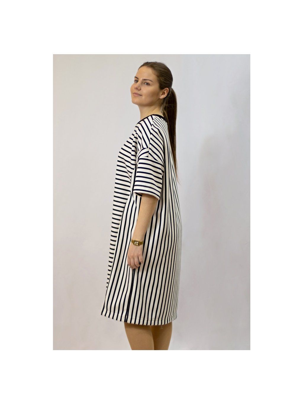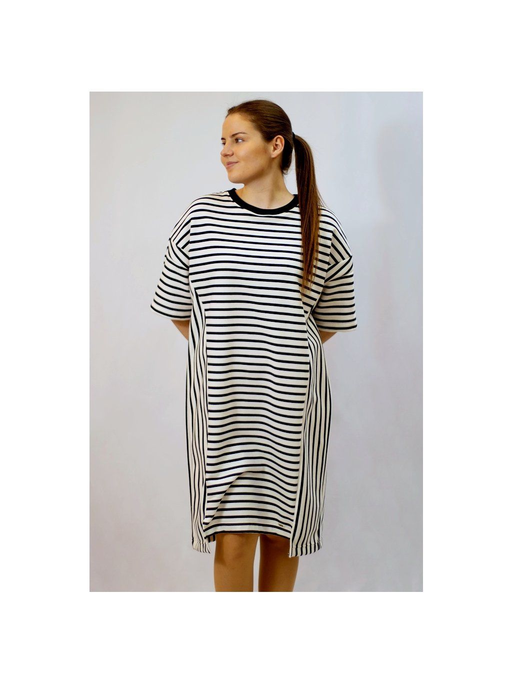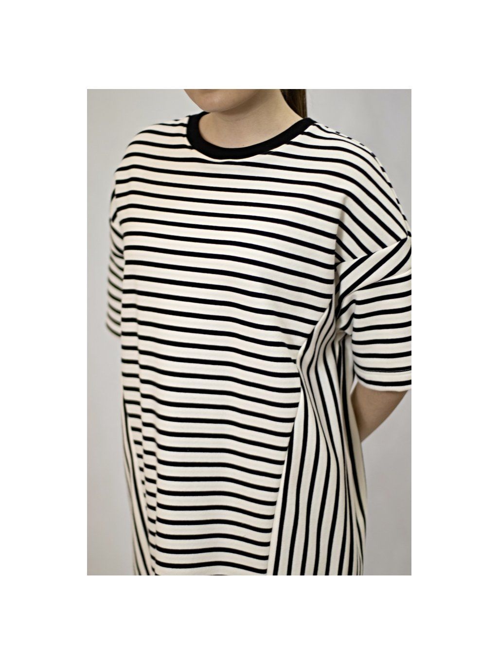 Originální kombinace svislého a vodorovného proužku dodává šatům moderní a hravý vzhled, který zaujme na první pohled. Volný střih poskytuje dostatek prostoru a je vhodný pro různé typy postav. Krátké rukávy podtrhují ležérní charakter modelu.