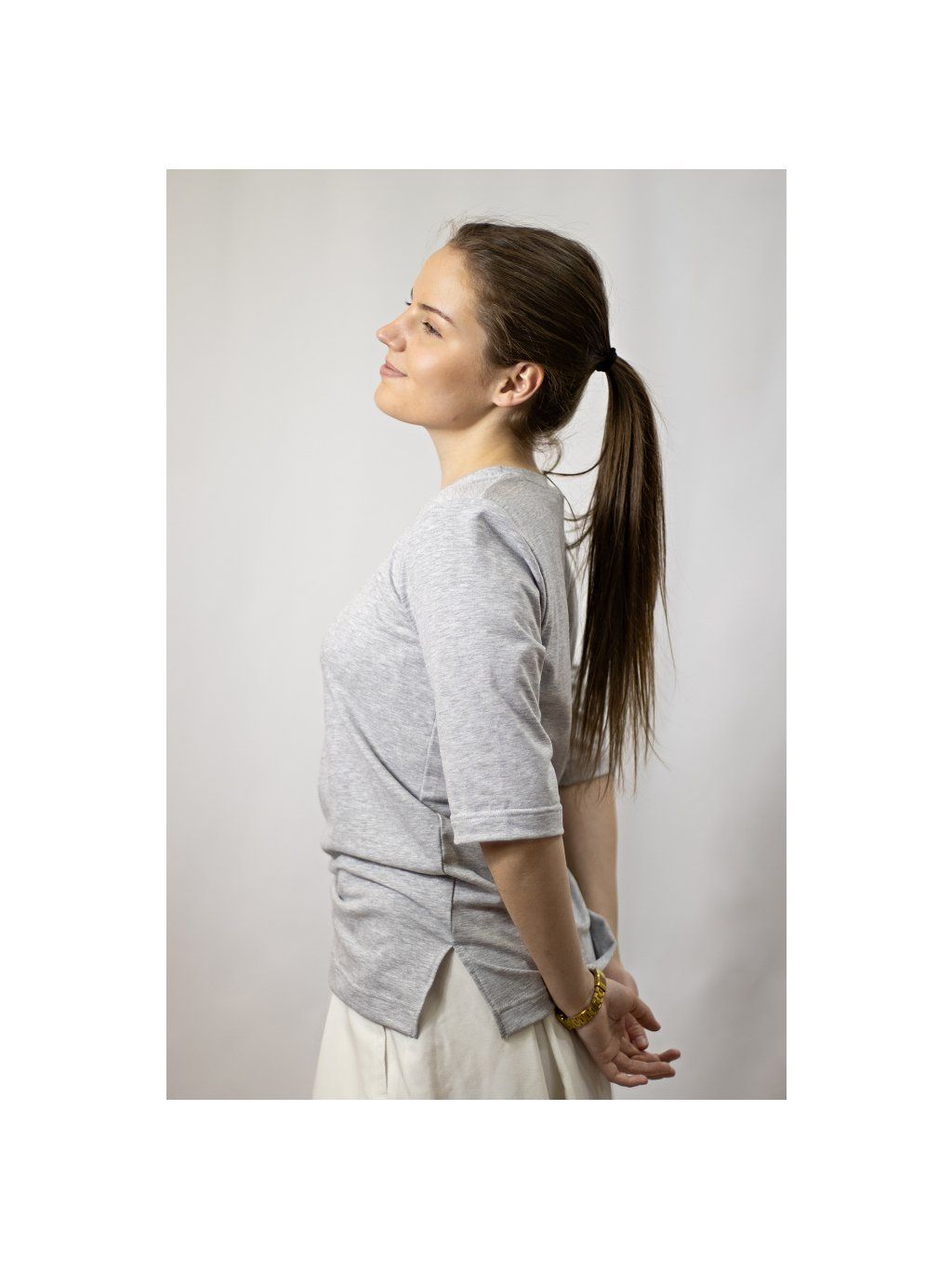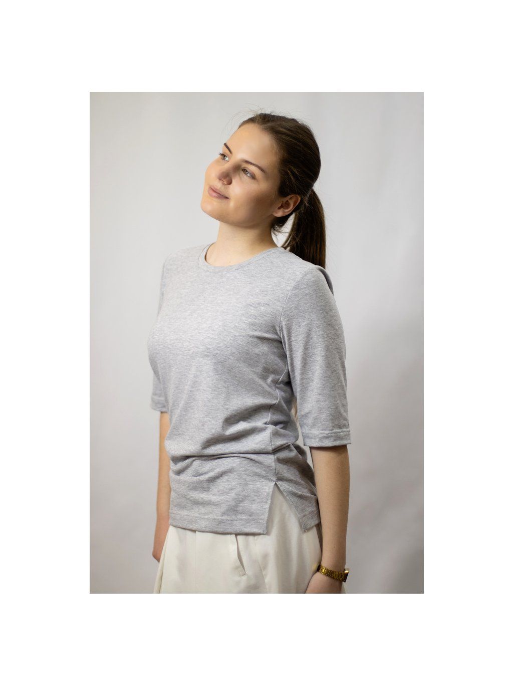 Dámské tričko z bavlněného úpletu je stylovým základem šatníku, který spojuje pohodlí s jemnou ženskostí. Přiléhavý střih zvýrazňuje siluetu a pružný materiál se dokonale přizpůsobí postavě.