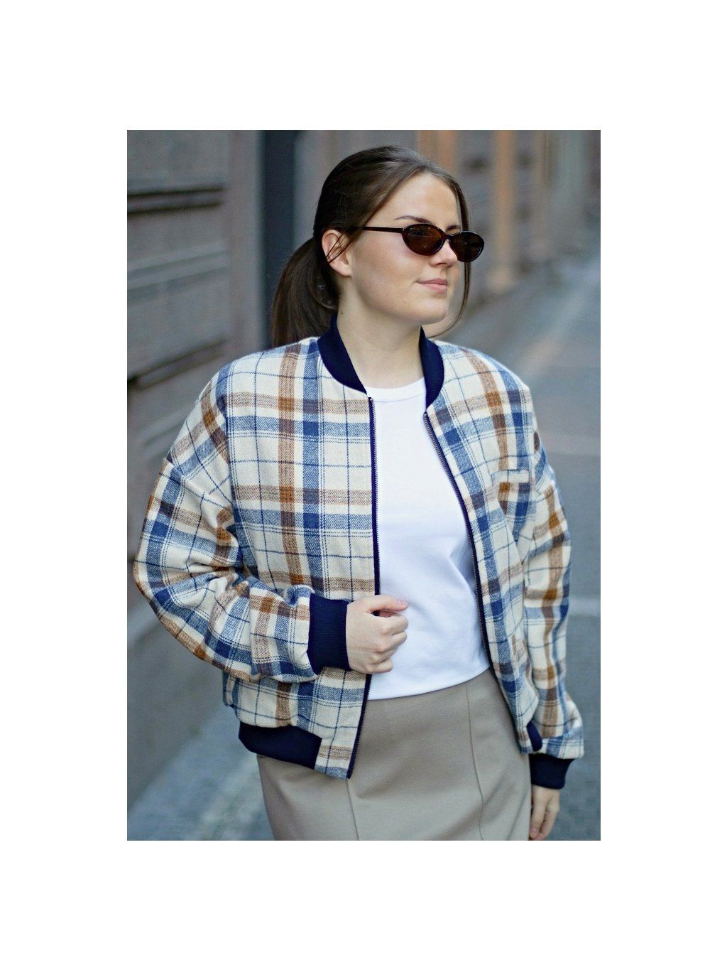 Vpředu zapínání na zip, kapsy na kostkované straně, dlouhé rukávy s pružnými manžetami, stojáček,