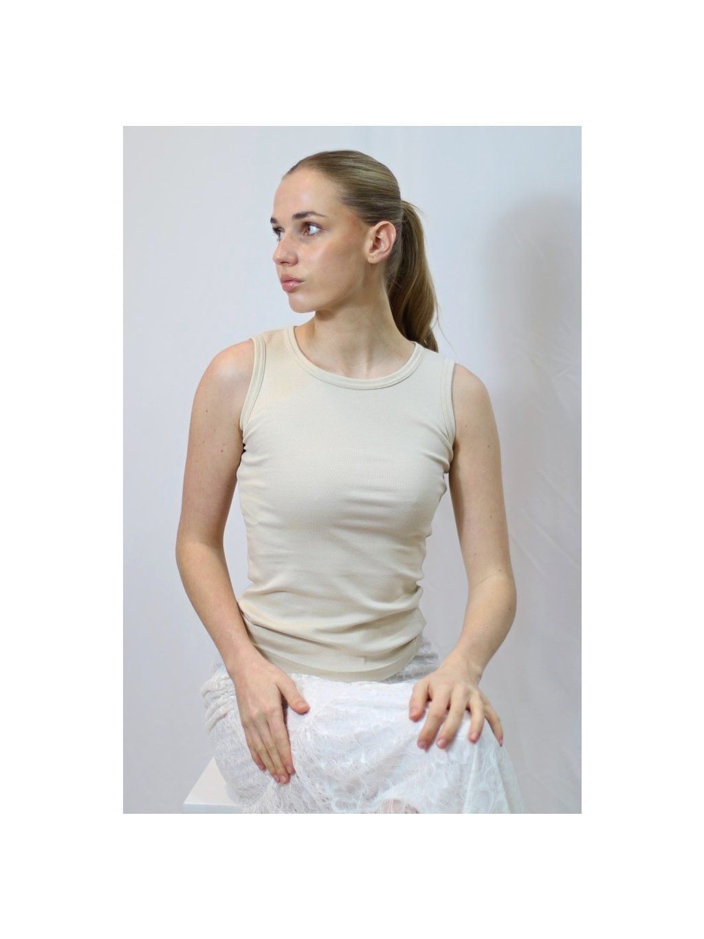 Top je vyroben ze žebrového úpletu, který je velmi pružný a příjemný na nošení, takže se dokonale přizpůsobí postavě a zajistí maximální pohodlí. Široká ramínka poskytují komfort i oporu, zatímco kulatý výstřih působí čistě a univerzálně.